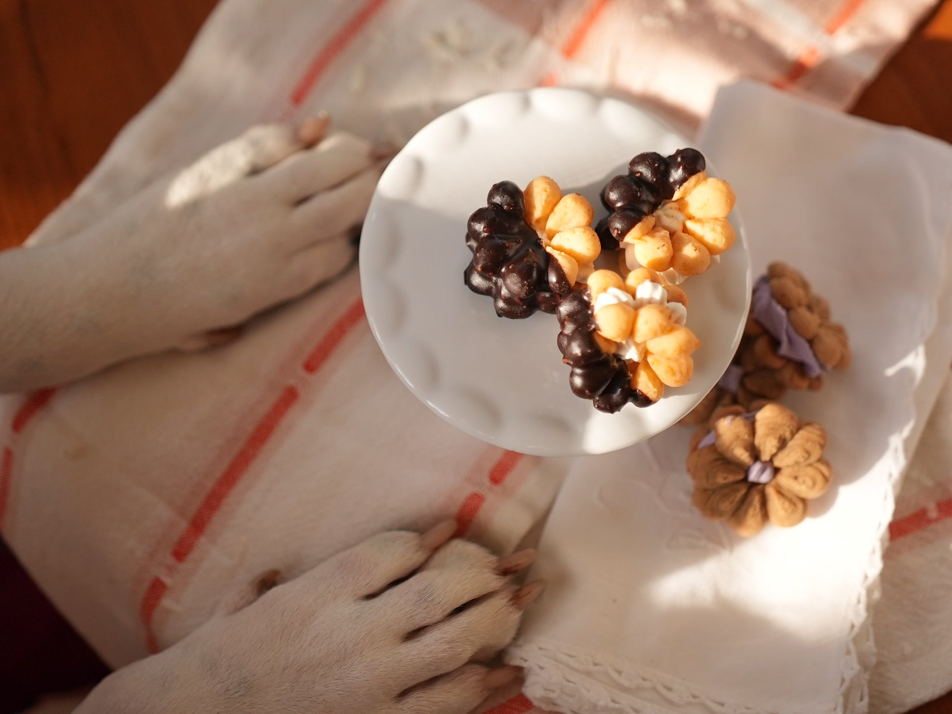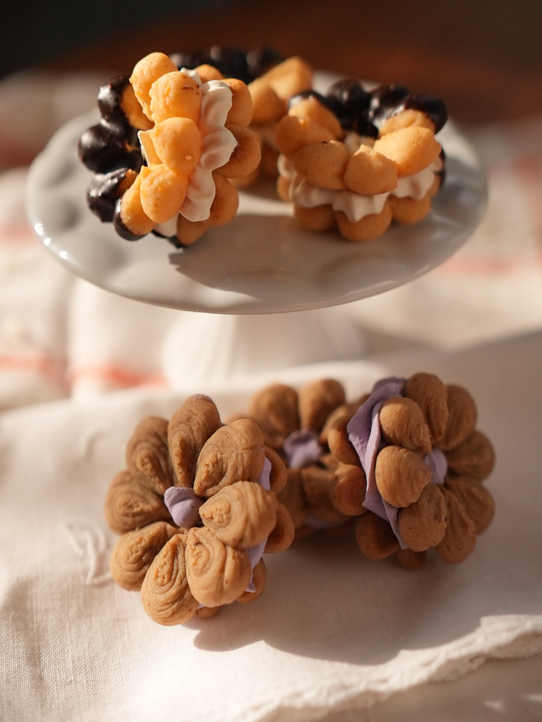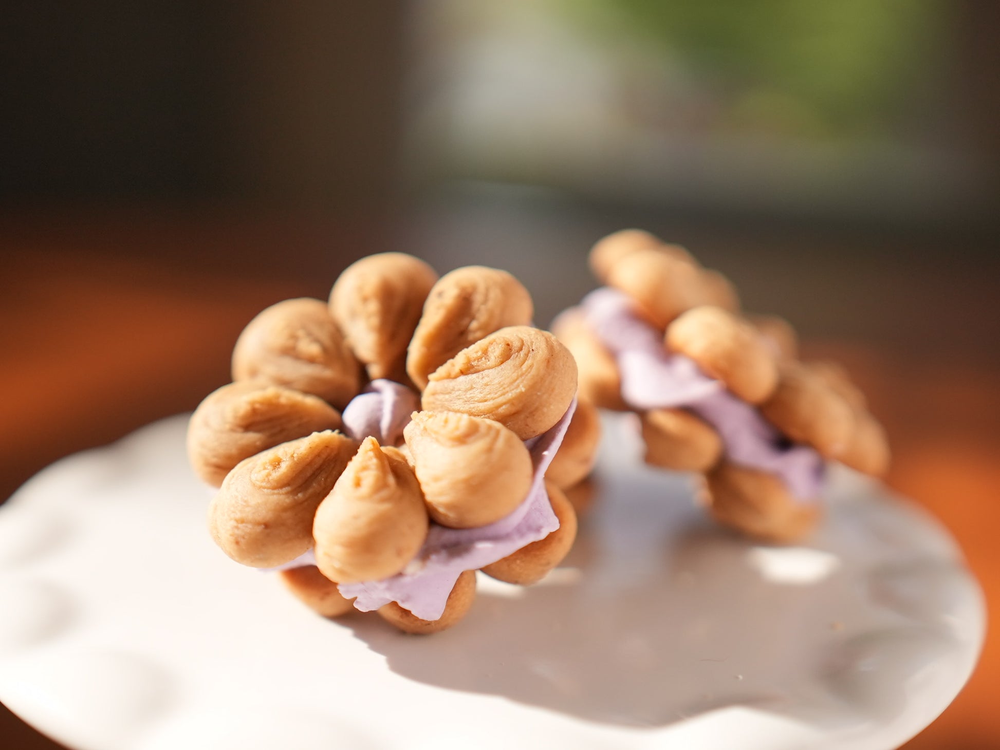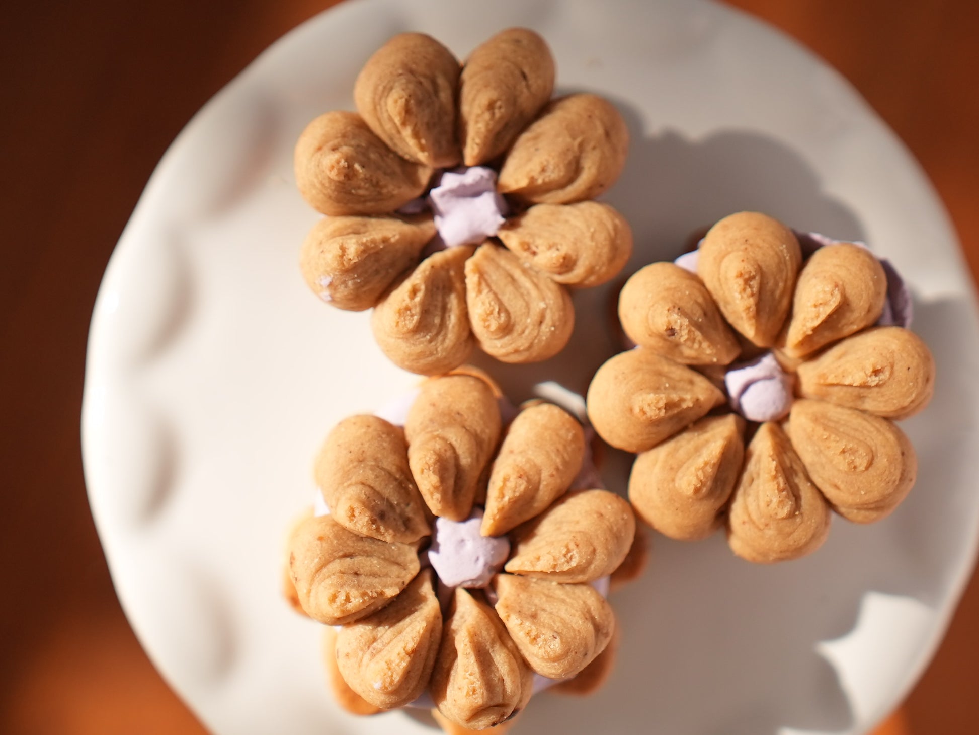 Whimsical flower-shaped sandwich cookies filled with a swirl of creamy delight.