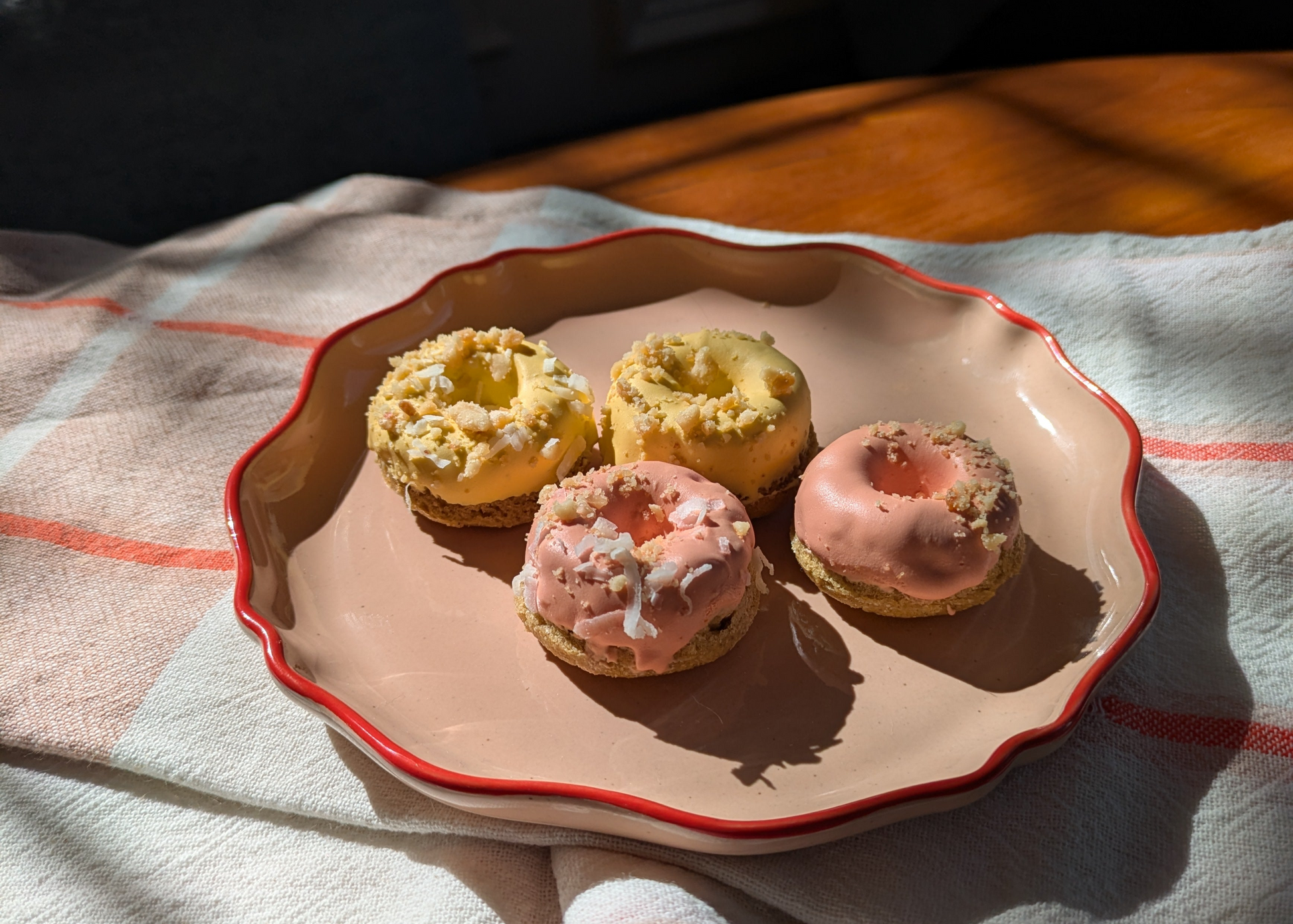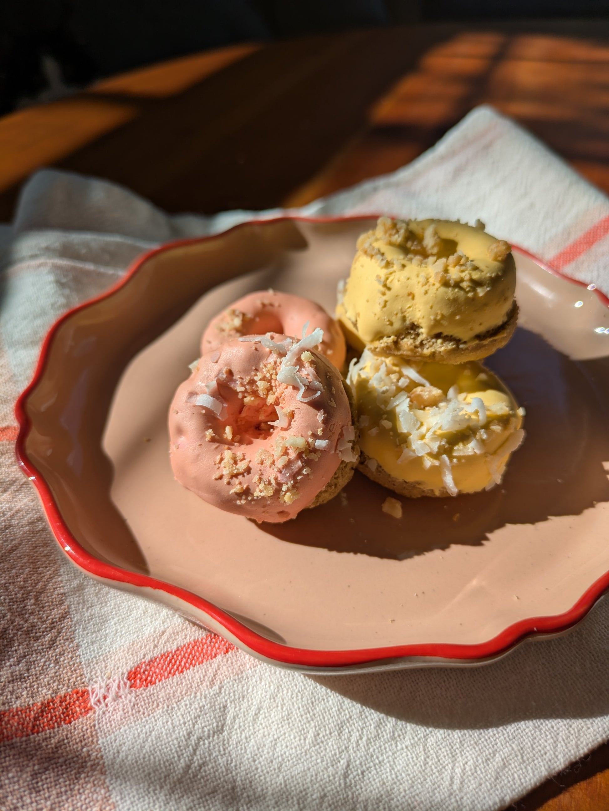 Charming mini donuts in sunny yellow and peach hues. A bite-sized indulgence made with the same natural ingredients for a sweet and wholesome treat.